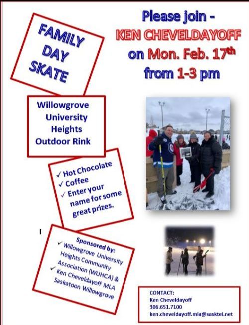 I look forward to seeing you this afternoon at the Willowgrove University Heights Community outdoor rink. It may be cold outside but there will be plenty of hot chocolate and coffee to keep you warm. Please join me and your neighbours any time from 1 pm - 3 pm.