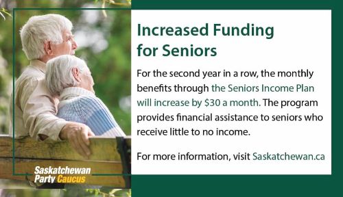 "Our government is following through on our commitment to make life more affordable for Saskatchewan seniors," Social Services Minister Gene Makowsky said. "This investment in the Seniors Income Plan will help seniors across the province participate in their communities while living more comfortably and securely."