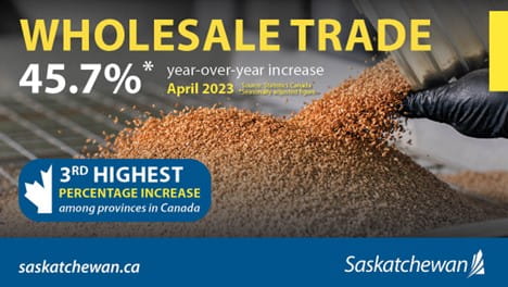 Statistics Canada released April 2023 wholesale trade figures, showing Saskatchewan with an increase of 45.7 per cent compared to the same time last year (seasonally adjusted). This was the third highest percentage change among the provinces.
