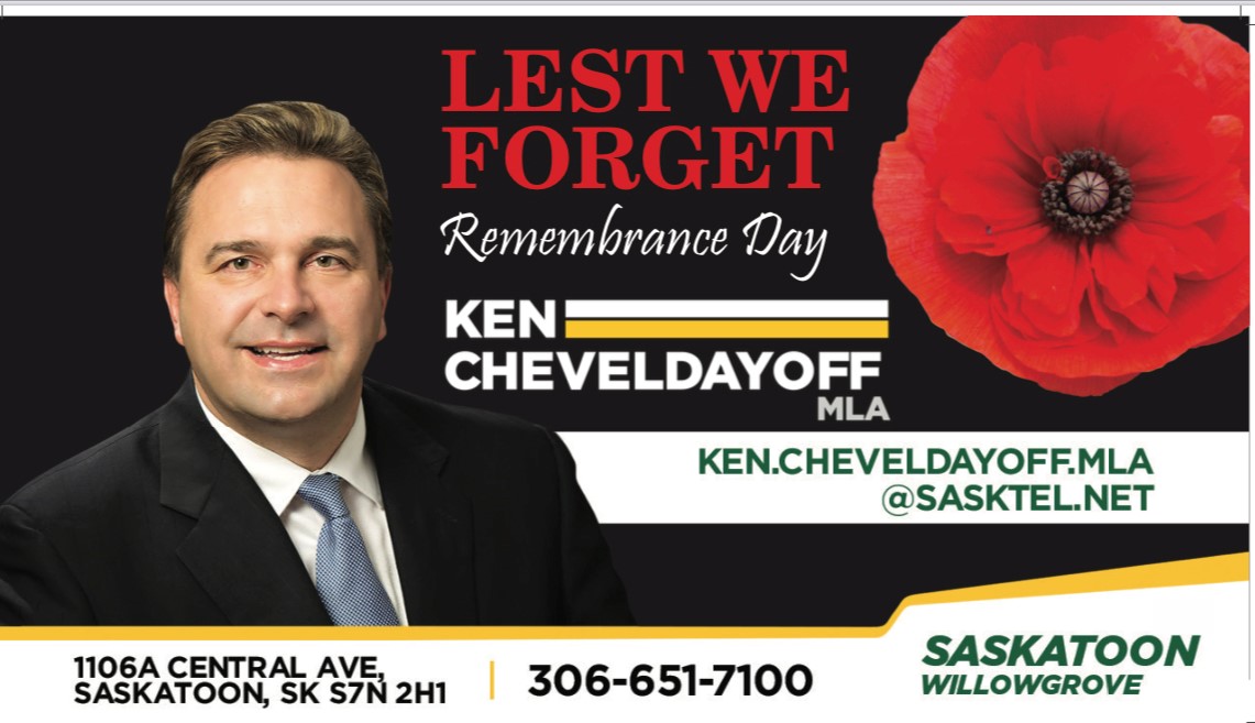 Early in this fall sitting of the Legislature and in advance of Remembrance Day on November 11, our government passed Bill 139 The Saskatchewan Remembrance Observance Act. This bill ensures employees are able to wear a poppy at work if they choose, unless it poses a danger to health, safety or welfare of the workers or others. Our veterans, current and past, have fought for our freedom and peace in Canada, and providing the right for workers to wear a poppy while in the workplace is a way to honour the sacrifice veterans and their families have made.
